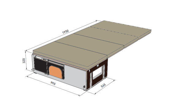 - die Hauptschublade mit Raum für Kocher, Wasser und Kühlbox, Maße: 990 x 545 x 320 mm