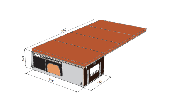 - die Hauptschublade mit Raum für Kocher, Wasser und Kühlbox, Maße: 990 x 545 x 320 mm