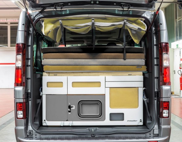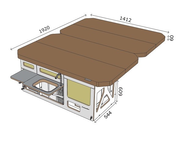 - die Hauptschublade mit Raum für Kocher, Wasser und Kühlbox. Zwei kleinere Schubladen für Küchenzubehör und eine Schublade mit Messer und Arbeitsfläche.