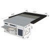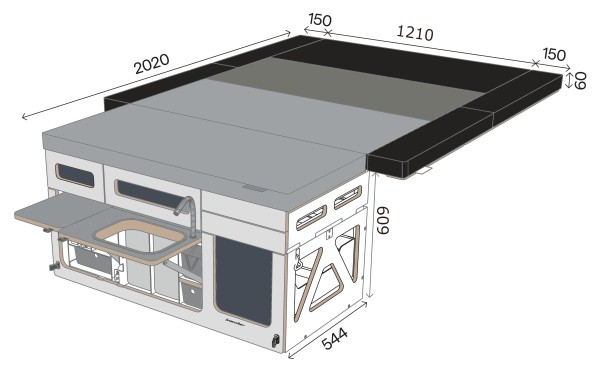 - die Hauptschublade mit Raum für Kocher, Wasser und Kühlbox. Zwei kleinere Schubladen für Küchenzubehör und eine Schublade mit Messer und Arbeitsfläche.