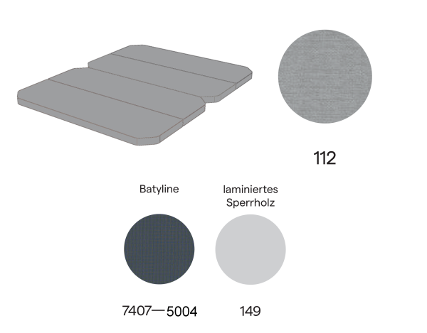 - Matratze in Farbe 112: besteht aus Klappteilen, die aus einem dreischichtigen PPUR sandwichartigen Kompositsystem hergestellt sind