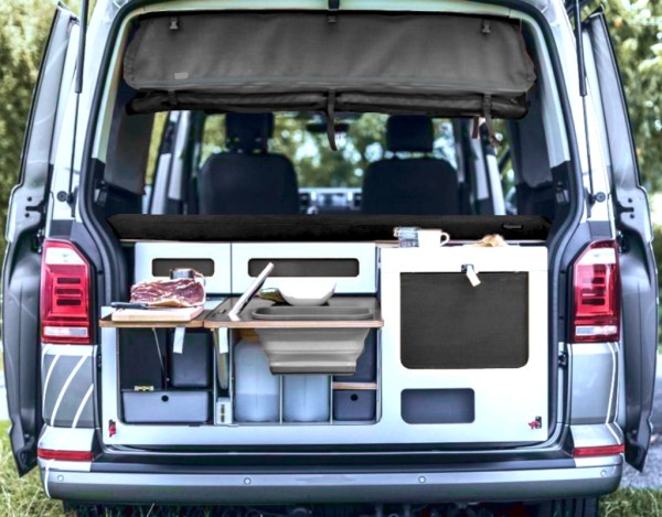 - die Hauptschublade mit Raum für Kocher, Wasser und Kühlbox. Zwei kleinere Schubladen für Küchenzubehör und eine Schublade mit Messer und Arbeitsfläche.