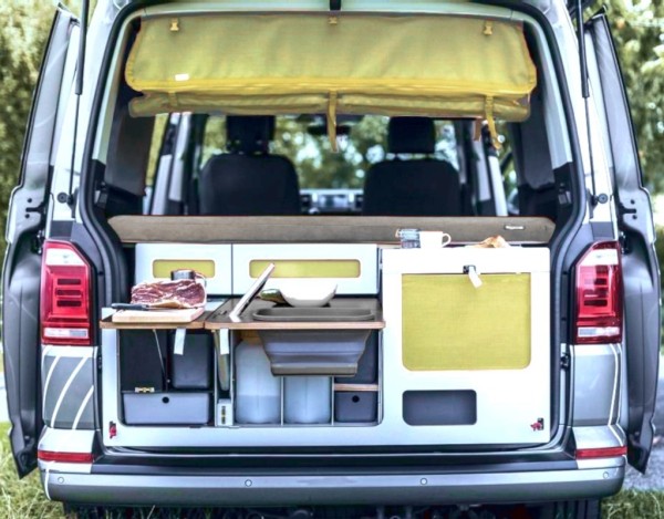 - die Hauptschublade mit Raum für Kocher, Wasser und Kühlbox. Zwei kleinere Schubladen für Küchenzubehör und eine Schublade mit Messer und Arbeitsfläche.