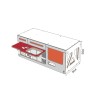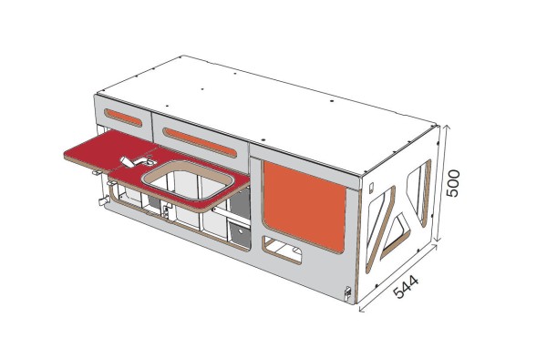 - die Hauptschublade mit Raum für Kocher, Wasser und Kühlbox. Zwei kleinere Schubladen für Küchenzubehör und eine Schublade mit Messer und Arbeitsfläche.