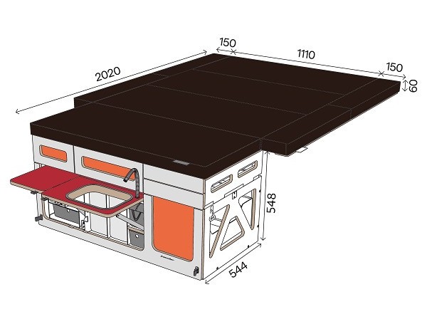 - die Hauptschublade mit Raum für Kocher, Wasser und Kühlbox, Maße: 1090 x 544 x 548 mm