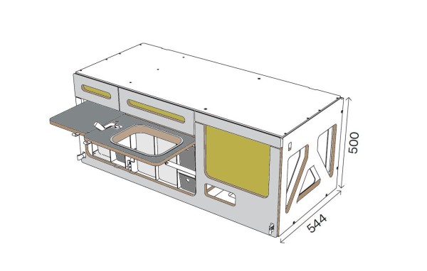 - die Hauptschublade mit Raum für Kocher, Wasser und Kühlbox. Zwei kleinere Schubladen für Küchenzubehör und eine Schublade mit Messer und Arbeitsfläche.