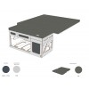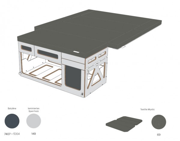 besteht aus Klappteilen, die aus einem dreischichtigen PPUR sandwichartigen Kompositsystem hergestellt sind und über eine rutschfeste Oberfläche aus PES an