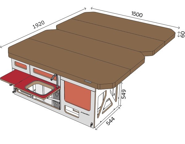 - die Hauptschublade mit Raum für Kocher, Wasser und Kühlbox. Zwei kleinere Schubladen für Küchenzubehör und eine Schublade mit Messer und Arbeitsfläche.