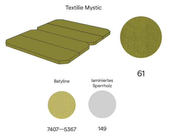 - Matratze in Farbe 61: besteht aus Klappteilen, die aus einem dreischichtigen PPUR sandwichartigen Kompositsystem hergestellt sind