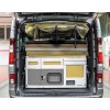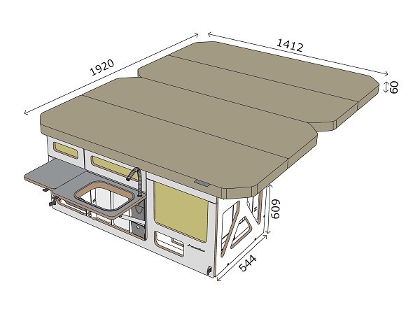 - die Hauptschublade mit Raum für Kocher, Wasser und Kühlbox. Zwei kleinere Schubladen für Küchenzubehör und eine Schublade mit Messer und Arbeitsfläche.
