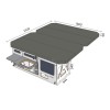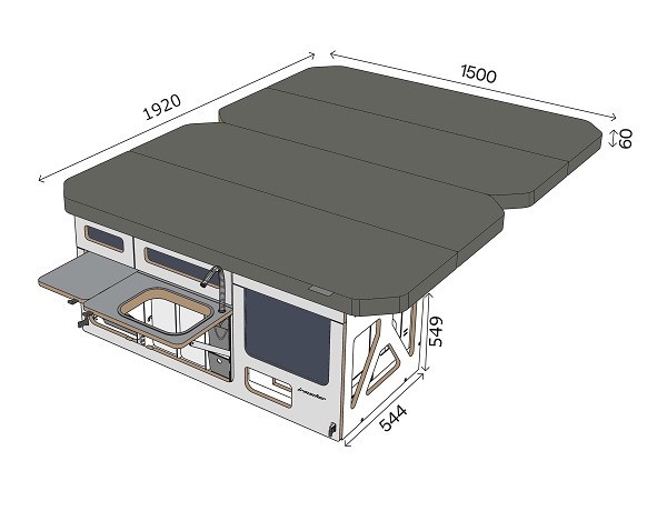 - die Hauptschublade mit Raum für Kocher, Wasser und Kühlbox. Zwei kleinere Schubladen für Küchenzubehör und eine Schublade mit Messer und Arbeitsfläche.