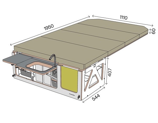 - die Hauptschublade mit Raum für Kocher, Wasser und Kühlbox, Maße: 1090 x 407 x 544 mm