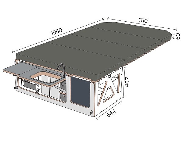 - die Hauptschublade mit Raum für Kocher, Wasser und Kühlbox, Maße: 1090 x 407 x 544 mm